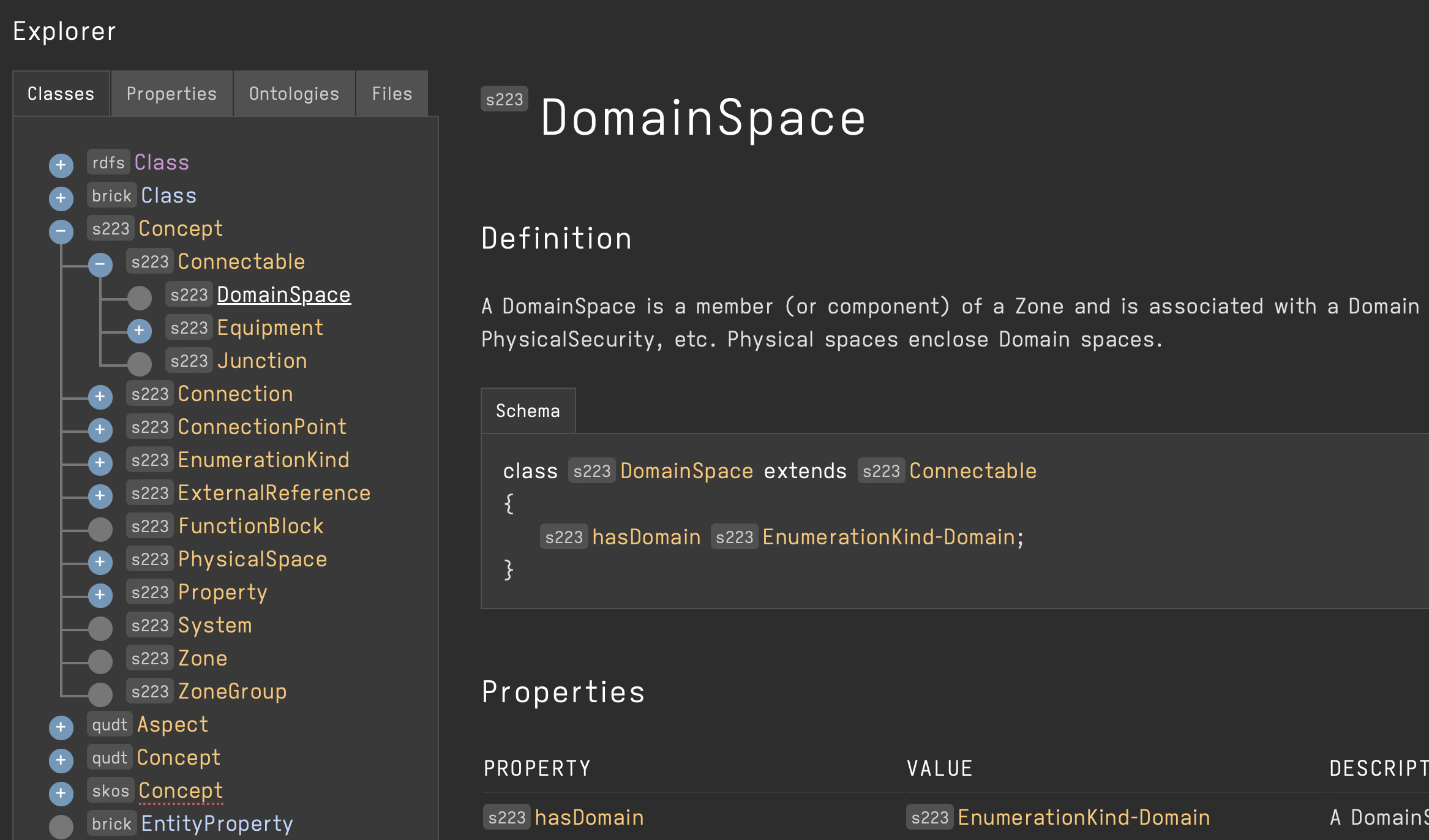 For example, all 223 classes are a subclass of s223:Concept, and can be accessed by clicking the “+” to the left of “Concept”.