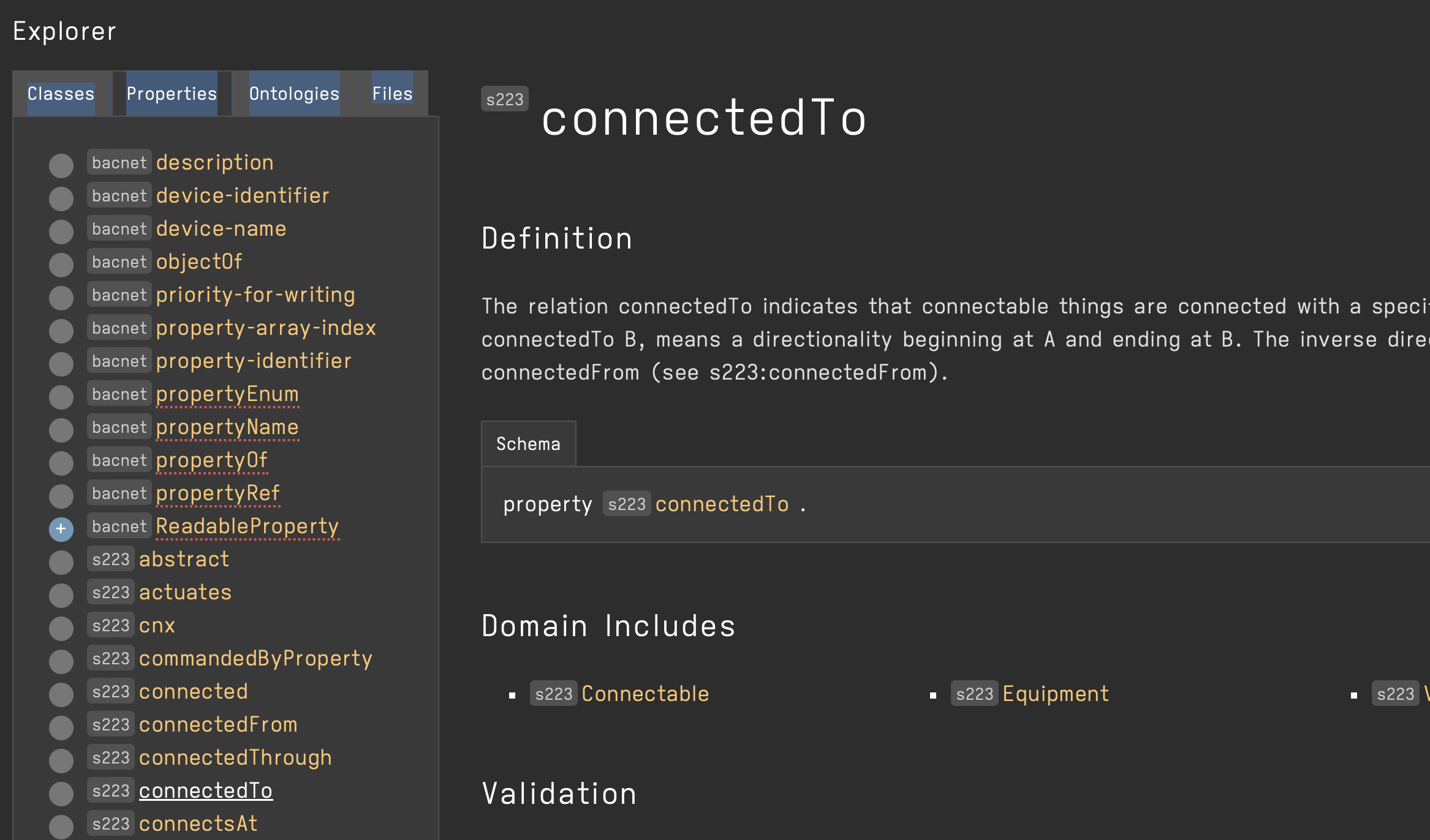 This page hosts autogenerated documentation of the 223 ontology, emphasizing the availability and correct use of concepts and properties defined by the ontology. The Explore tool divides the ontology up across four tabs.