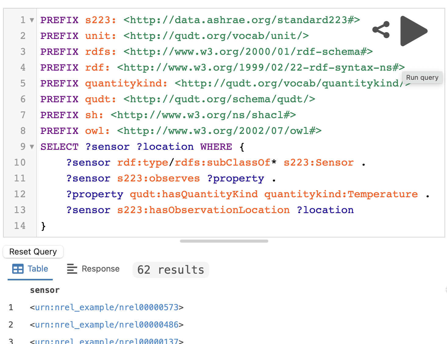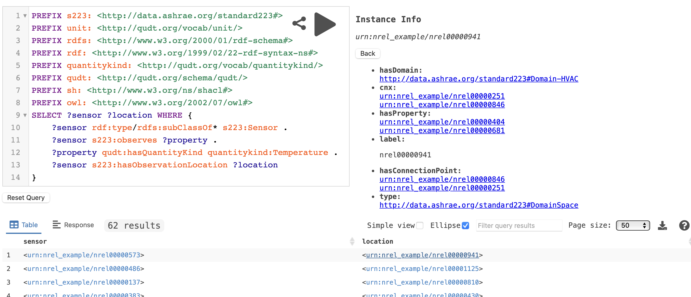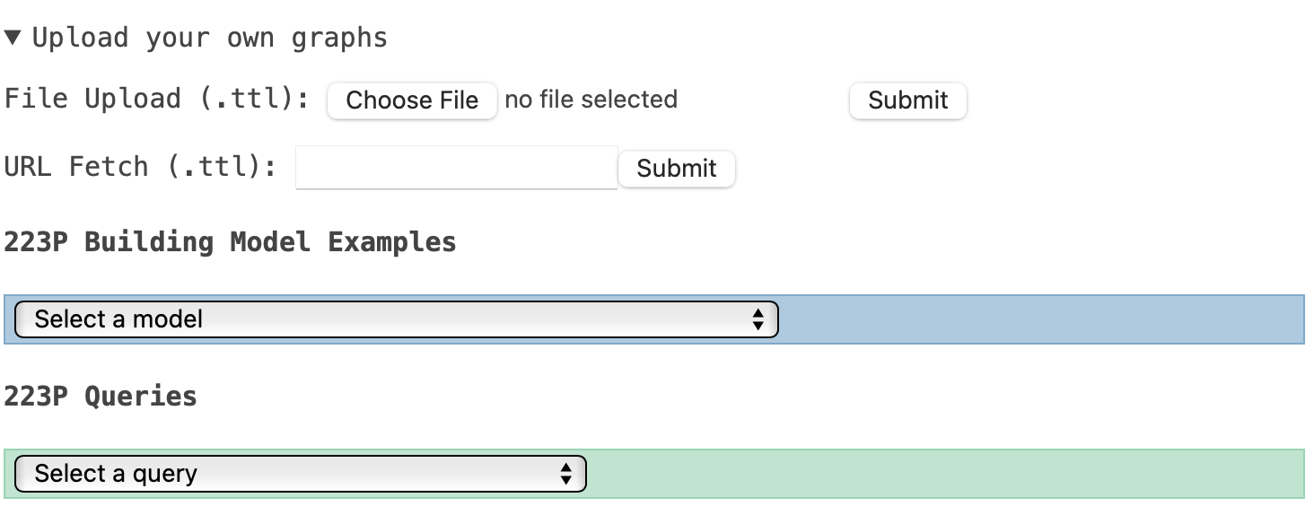 This page provides client-side SPARQL query processing using Oxigraph. It contains several example 223 models and several example queries. There are three dropdowns in the top-left corner of the page: