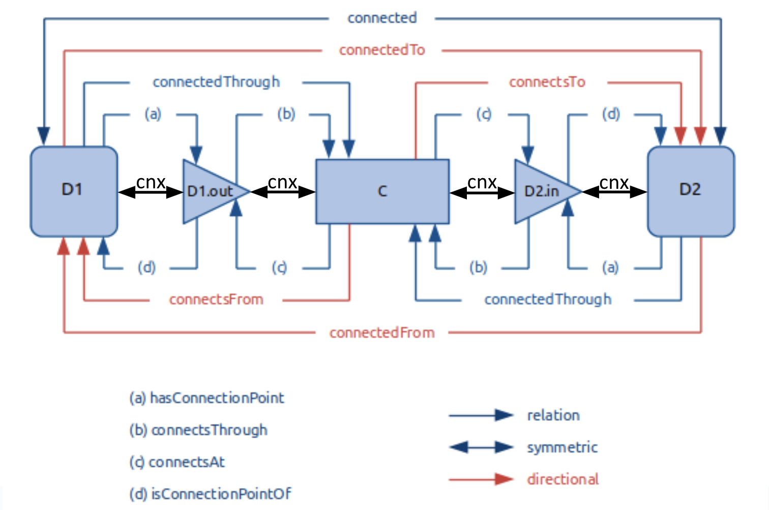 This standard can be used to describe the topology of the equipment and spaces in a building, but not the geometric details. Topology refers to the way entities are connected and how some media (e.g. water, air, or electricity) is conveyed between them. There are several different classes used to describe which entities participate in connections and how they connect: Connectables, which include the entities that are capable of connecting to each other; ConnectionPoints, which model where Connectables can be connected; and Connections, which describe physical things through which the medium is conveyed, like pipes or ducts. These Mediums (e.g. gas, electricity, water) are defined as an EnumerationKind in the standard. There are also multiple relations used to describe the details of these connections, and how the multiple entities involved in a connection relate to each other. Figure 1 summarizes these relations. Though there are many relations to describe different perspectives of a connection, only s223:cnx needs to be manually added to the model, and the rest can be automatically added to the model through the process of inference.